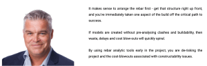 Our Founder and CTO Alan Jeffreys spoke to ConstructionTechReview about the importance of modeling your rebar first, particularly on complex infrastructure projects, to de-risk the project and reduce constructability issues. Taking this approach can create significant savings in terms of